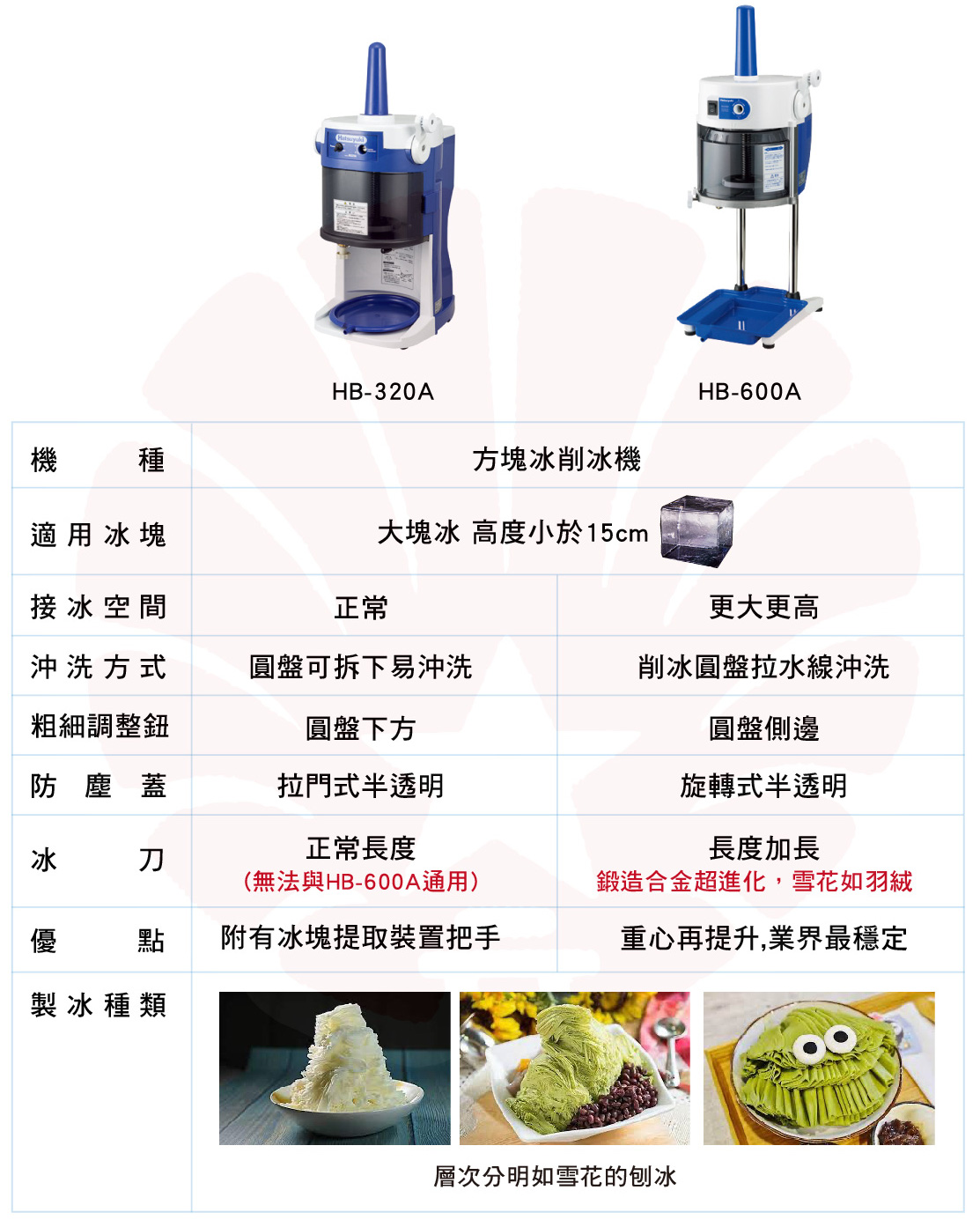 | 出冰形式 | 一般雪花冰 | 綿密雪花冰(可作造型冰) |
